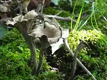 Craterellus fallax is a species of "black trumpets" that occurs in Eastern North America where it replaces the European taxon Craterellus cornucopioides. C. fallax can also be separated by its yellow-orange spore print, where C. cornucopioides has a white spore print. It has often been considered a synonym of C. cornucopioides.[1][2][3] C. fallax is mycorrhizal, forming associations with Tsuga and Quercus species, among others.[4]