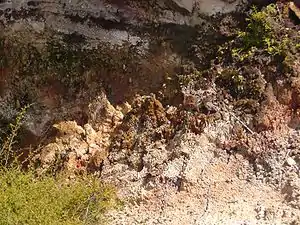 Currently, only one of the craters has a mudpool. Here the gases (mainly H2S) react with water to form sulphuric acid. This reacts with the rocks, turning it to clay. When there is water present, this forms the grey coloured mudpools “that bubble and burp as steam and gas escape through them”.[9]