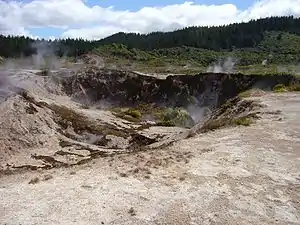 Craters of the Moon Thermal Area (or Karapiti in Māori language) is a region with geothermal activity north of Taupo, New Zealand. It is a part of Wairakei, the largest geothermal field in New Zealand, with a surface area of about 25 km2, which lies in the Taupo Volcanic Zone. The name springs from the many hydrothermal eruption craters, which are in part barren and which have bright colours. Combined with the numerous steam vents, constantly shifting, collapsing and reforming giving the whole area desolate appearance, and the sulphur smell, the whole area has an “unearthly” atmosphere. The craters are a relatively recent feature of the area and appeared as a result of human activity in the region.