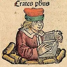 ![]() Crates of Athens, depicted as a medieval scholar in the Nuremberg Chronicle | |