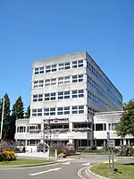 The new building was designed by Cartwright Pickard in the International Style, built by Kier Group in concrete and glass.[10][11] The design involved a nine-storey square-shaped building: the lower storeys were reserved for municipal use while the upper storeys made available for commercial tenants.[12] At the southwest corner of the building, the lower two floors were recessed to create an entrance and a large carving of the borough coat of arms was installed there in August 2022.[13] The new building was formally opened on 21 March 2023.[14]