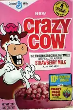 Crazy Cow was a breakfast cereal produced by General Mills during the 1970s. The cereal was somewhat of a novelty item in that it had an unusual trait. The round, multi-grain cereal pellets were coated with an excipient of a drink mix. When milk was added, it would dissolve the powdered coating, and the resultant mixture would resemble in sight, smell, and taste, a flavored milk. Crazy Cow came in two flavors, chocolate and strawberry.[1] As the box indicated, these were just flavors; no actual chocolate or strawberries were in the ingredients. The box always contained the disclaimer "artificially flavored" or "chocolate flavored".