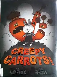 Creepy Carrots! is a 40-page children's picture book written by Aaron Reynolds and illustrated by Peter Brown. It was published on August 21, 2012, by Simon & Schuster Books for Young Readers.[1] In 2013, a 10-minute animated film based on the book was made by Weston Woods Studios and narrated by James Naughton.