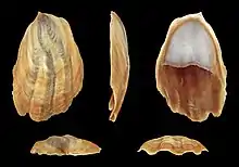 - The apex is low and near the margin of the shell, curved to one side and not markedly hooked (rather than high, hooked and centrally placed),