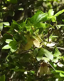 Acer sempervirens is an evergreen or semi-evergreen shrub or small tree, one of the very few evergreen species in the genus. It grows to 10 metres (33 ft) tall with a trunk up to 50 centimetres (20 in) in diameter. The bark is dark grey, smooth in young trees, becoming scaly and shallowly fissured in mature trees. The shoots are green at first, becoming dull brown in the second year. The leaves are opposite, hard and leathery in texture, 1–4 centimetres (0.39–1.57 in) long and 1–3 centimetres (0.39–1.18 in) across, glossy dark green with a yellow 1 centimetre (0.39 in) petiole, variably unlobed or three-lobed (often on the same shoot); the lobes have an entire (toothless) margin. The flowers are yellow-green, produced in small pendulous corymbs. The fruit is a double samara with two rounded, winged seeds, the wings 1.5–3 centimetres (0.59–1.18 in) long, spread at an acute angle.[3][5][6]