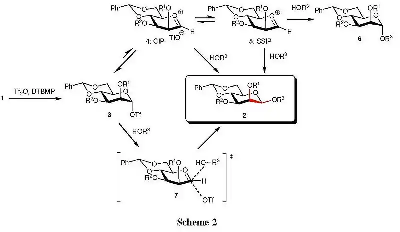 For the intermediate CIP 4, the triflate anion is closely associated with face where it just departed thus shields that side against nucleophilic attack. For the alternative intermediate SSIP 5 which is in equilibrium with an initial CIP, the anomeric center could presumably be attacked by incoming alcohol from either face, giving β-mannoside 2 along with the undesired α-anomer 6. Along these lines, the presence of the 4,6-O-benzylidene protecting group, which serves to rigidify the pyranoside against rehybridization at the anomeric carbon, is essential in shifting the equilibrium toward the covalent triflate, thus reducing α-glycoside formation. Additionally, the only intermediate observed by NMR spectroscopy is the covalent triflate 3, indicating that the complete set of equilibria between 3, the CIP 4, and SSIP 5 set is very heavily biased towards 3.