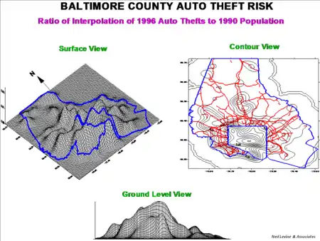 - Dual kernel density interpolation of two variables (e.g., a set of events in relation to a population ‘at risk’)
