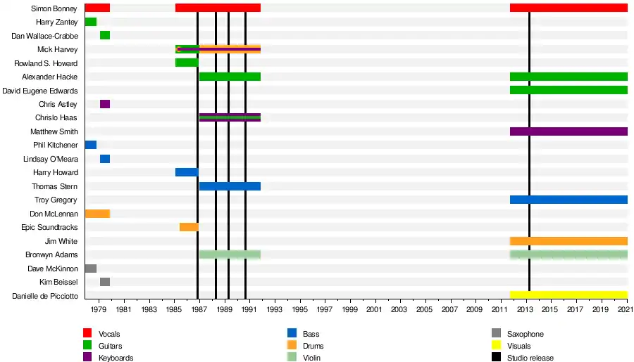 In late 1978 Bonney and McLennan had relocated to Melbourne where they formed a new version of Crime & the City Solution with Chris Astley on keyboards, Kim Beissel on saxophone, Lindsay O'Meara on bass guitar (ex-Voigt/465) and Dan Wallace-Crabbe on guitar.[2][3] In Melbourne Bonney became friends with local post-punk group, The Boys Next Door (later known as The Birthday Party).[2][6] Crime & the City Solution broke up in 1979 after a number of live shows and recording an unreleased demo.[2] Wallace-Crabbe later joined Laughing Clowns, O'Meara returned to Sydney and joined Pel Mel, Beissel played in → ↑ →, Astley and McLennan in other bands.