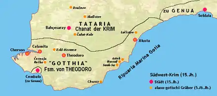 The Crimean Goths were Greuthungi-Gothic tribes who remained in the lands around the Black Sea, especially in Crimea. They were the longest-lasting of the Gothic communities. Their existence is well attested through the ages, though the exact period when they ceased to exist as a distinct culture is unknown; as with the Goths in general, they may have become diffused among the surrounding peoples. In his Fourth Turkish letter, Ogier Ghiselin de Busbecq (1522-1592) describes them as "a warlike people, who to this day inhabit many villages".[1] However, in the 5th century, the Ostrogothic ruler Theodoric the Great failed to rouse Crimean Goths to support his 488-493 war in Italy.[2][3] In medieval times it was customary to refer to a wide range of Germanic tribes as "Goths", so the exact ethnic nature of the Germanic peoples in Crimea is a subject of debate.