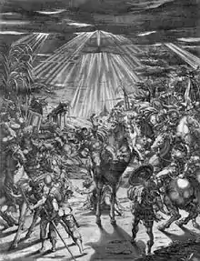 Cristofano Bertelli (active c. 1525) was an Italian engraver. He was born in Rimini in the Duchy of Modena. A few of his plates survive: Portrait of Ottavio Farnese, Duke of Parma; Conversion of St. Paul; Holy Family with Saints Augustine, Sebastian, & Helena, with St. Joseph sleeping. Virgin and Child with St. George and other Saints; Virgin and Child, with Saints Sebastian, Francis, and Roch after Correggio; and The different Ages of Man.[1]