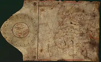 Most scholars of the time accepted Ptolemy's estimate that Eurasia spanned 180° longitude,[59] rather than the actual 130° (to the Chinese mainland) or 150° (to Japan at the latitude of Spain). Columbus believed an even higher estimate, leaving a smaller percentage for water.[60] In d'Ailly's Imago Mundi, Columbus read Marinus of Tyre's estimate that the longitudinal span of Eurasia was 225° at the latitude of Rhodes.[61] Some historians, such as Samuel Morison, have suggested that he followed the statement in the apocryphal book 2 Esdras (6:42) that "six parts [of the globe] are habitable and the seventh is covered with water."[62] He was also aware of Marco Polo's claim that Japan (which he called "Cipangu") was some 2,414 km (1,500 mi) to the east of China ("Cathay"),[63] and closer to the equator than it is. He was influenced by Toscanelli's idea that there were inhabited islands even farther to the east than Japan, including the mythical Antillia, which he thought might lie not much farther to the west than the Azores.[64]