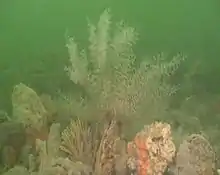 Crisularia plumosa is a filter feeder; the tentacles on the lophophore create a current that wafts diatoms, bacteria and other small organic particles within reach, and these are conveyed to the mouth. This species is a protandrous hermaphrodite and colonies have both male and female zooids; each individual zooid starts its existence as a male and later becomes a female. Sperm, liberated into the water column by male zooids, is drawn into female zooids where fertilisation takes place; the embryos are retained in a brood chamber. The larvae have a short planktonic phase before settling on the substrate and undergoing metamorphosis.[2] Other animals, such as small sea spiders, sometimes take shelter among the branchlets of the clumps.[2] Alongside Flustra foliacea, this species forms part of a dense bryozoan "turf" that is found on heavily silted but moderately wave-exposed rocks and boulders round certain coasts of Britain just below the littoral zone; the habitat is dominated by sponges Suberites ficus, Suberites carnosus and Hymeniacidon perleve.[3]