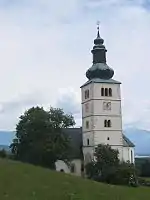 The church's artwork includes a painting of Holy Sunday from the workshop of Johannes of Ljubljana (ca. 1460), a Gothic painting of Saint Christopher on the south wall from 1464, a painting of Saint Christopher on the bell tower, and remnants of frescoes from the 14th and 15th centuries on the north wall of the nave. There are four 17th-century gilded altars where the nave meets the chancel; above the altar dedicated to Saint Martin there hangs a whale rib, referred to as the rib of a giantess in popular tradition. The main altar was created in 1652 by the Ljubljana sculptor Jurij Skarnos and was gilded by Jakob Jamšek of Škofja Loka. The forged railing in front of the main altar was created by the Škofja Loka locksmith Gregor Jesenko.[5] The Baroque organ, work by the organ builder Joannes Franciscus Janecheck, dates to 1743.[13]
