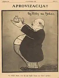 ![]() 1915 caricature from the Carnival magazine shows the sharp contrast of pre-war and wartime life in Zagreb | |