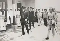 An extraordinary session of the Croatian Parliament, which was convened to read a loyalty oath to the Empire and statement of condolence, was interrupted with accusations and recriminations against ruling Croatian-Serbian coalition by the members of Party of Rights (HSP). The HSP politician Ivo Frank allegedly threatened the Serb representatives with a revolver.[17] On 26 July, partial mobilization was announced. The next day, ban Iván Skerlecz issued a special regulation abrogating Ivan Mažuranić's 1875 Law on Freedom of Assembly. After war was declared on 28 July, many pro-war demonstrations were held in Zagreb. The arrival of recruits to the Zagreb barracks was welcomed with approval. People shouted to the soldiers: "Long live the Croatian army", to which the soldiers would respond: "Long live Croatia, long live the Croatian King [Franz Joseph]".[18]
