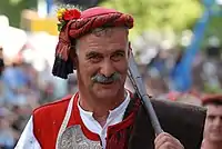 Perhaps the most famous example of Zagora costume comes from the small town of Vrlika, rich in dance and tradition still carried on today. Both men and women's dress wear is characterized by multiple subjects of clothing over another.[7] For men, the costume consists of carefully chosen pieces worn over each other: a red sash is tied around dark pants with a fringe of threads hanging from the belt in red, blue, or green colors. Due to centuries of military mentality, a special leather belt is worn to carry weapons.[7] Over the shirt is a decorated tunic, elaborate in design and custom-made fringe. The vest that is worn is vastly decorated with gold and red embroidery and patterns and designs, with different styles or material and cut depending on the seasonal weather. Much like the men, the women's dress consists of clothing worn over more clothing: a white blouse, skirt or tunic is most common, with a colorful apron consisting of complicated geometric patterns and fringe worn over, as well as a red vest with gold stitching made in a way to make it stand out from the white blouse.[7] Jewellery consists mainly of beads worn around the neck and silver coins adorned around the costume. Both men and women wear red felt pillbox caps (bareta or crvenkapa), with a white habit attached to the women's.