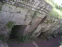 It is dated to at least the 6th century because of inscriptions found at the site.[2] It was attended from the 8th to the 3rd centuries B.C.[3] However, its apex of development was in the 6th and 5th centuries.[3] It is to this time that the layout of the necropolis, grouped in blocks, is dated.[3] It consists of over 200 tombs.[4] The burials were fashioned from the local stone-like amalgam called tuff, a mixture of lava and ash.[2][4] They are of "chamber" type, mostly arranged in a network of sepulchral streets, forming an orthogonal system.[2]