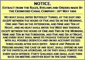 The sign illustrated (left) was displayed at both ends of the Butterley tunnel, and stressed the importance of only using the narrow tunnel in any one direction at particular times. There are reported instances of fines levied for non-compliance with these rules.[7]