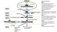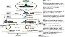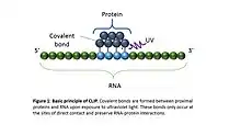 CLIP begins with the in-vivo cross-linking of RNA-protein complexes using ultraviolet light (UV). Upon UV exposure, covalent bonds are formed between proteins and nucleic acids that are in close proximity (on the order of Angstroms apart).[5] The cross-linked cells are then lysed, RNA is fragmented, and the protein of interest is isolated via immunoprecipitation. In order to allow for priming of reverse transcription, RNA adapters are ligated to the 3' ends, and RNA fragments are labelled to enable the analysis of the RNA-protein complexes after they have been separated from free RNA using gel electrophoresis and membrane transfer. Proteinase K digestion is then performed in order to remove protein from the crosslinked RNA, which leaves a few amino acids at the crosslink site. This often leads to truncation of cDNAs at the crosslinked nucleotide, which is exploited in variants such as iCLIP to increase the resolution of the method.[6] cDNA is then synthesized via RT-PCR followed by high-throughput sequencing followed by mapping the reads back to the transcriptome and other computational analyses to study the interaction sites.[2]