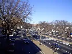 Woodhaven Boulevard is an 8- to 11-lane boulevard throughout its entire length,[7] stretching up to 195 feet (59 m) in width, making it the widest street in Queens that is not either a limited-access highway or a state route. The only street in Queens that isn't a highway to surpass it in width is Queens Boulevard (NY 25) at 225 feet (69 m).