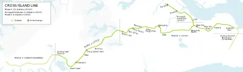 The Cross Island Line (CRL) is a high capacity mass rapid transit (MRT) line under development in Singapore that will run in a generally east–west direction from Changi to Jurong Industrial Estate via Loyang, Pasir Ris, Hougang, Ang Mo Kio, Sin Ming, Bukit Timah, Clementi and West Coast. From Pasir Ris, the line will branch off to Punggol.[2] The 58-kilometre (36 mi) line will replace the East West Line as the longest line on the MRT network upon its complete opening by the 2040s, serving about 27 stations.[3]