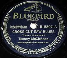 Tommy McClennan's "Cross Cut Saw Blues" is a Delta blues, that follows the hokum style of the time.[3] McClennan, who sings and plays acoustic guitar, and an unknown bass player, recorded the song at the RCA Studio A in Chicago on September 15, 1941.[4] The lyrics make use of double-entendre:[3]