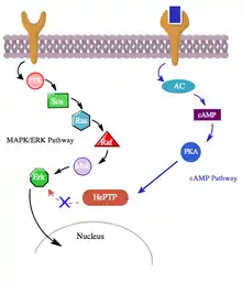 Phosphorylation of this third site by PKAs from the cAMP pathway inhibits binding of MAP kinases to HePTP and thereby upregulates the MAPK/ERK signaling cascade. The MAPK pathway, through Ras, Raf, Mek, and Erk, shows low activity in the presence of unphosphorylated (active) HePTP. However, activation the cAMP pathway stimulates the activation of PKA, which in turn phosphorylates HePTP at Ser23. This prevents HePTP from binding to Erk and frees the MAPK pathway from inhibition, allowing downstream signaling to continue (see figure 4).