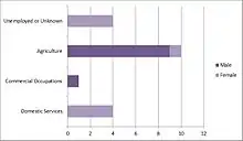Some data was given in 1881 as to what occupations were held by the people of Croughton. Overall, 19 people, male and female, were accounted for in the data. Compared to the census data of the same year, either the 10 remaining people were unaccounted for, were children or had died by the time the data was collected. The '1881 Data for the occupations of Croughton' chart below shows the data for the 1881 occupational census data for the township of Croughton. Because of Croughton's rural location, it is unsurprising that the majority of people worked in agriculture.[7]
