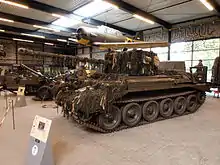 The first prototype was ready in August 1942, only seven months after development had commenced, but proved to be very flawed. An improved second prototype was presented in January 1943 but was still considered unacceptable. A committee met to determine whether a requirement for a 17-pounder tank existed. The Challenger had been developed in anticipation of more heavily armoured Axis tanks, following the trend in Nazi German tank design. At roughly the same time the Tiger 1 entered service with the German army, placing an immediate need for a 17-pounder armed tank in response.[7] When the second prototype was tested at Lulworth, it was found that although it would be effective at long range against the current best-gunned tank in German service (the Panzer IV "Special" with the long 75 mm (3.0 in) gun), at shorter ranges it would be at a disadvantage due to its slow firing rate and thin armour. The design received additional emphasis when, in May 1943, it was found that the Cromwell could not carry its intended armament. Vickers had been developing a 75 mm (3.0 in) 50-calibre-long high-velocity tank gun. It was realised late in the design process that the Cromwell's turret ring was too small for this gun.[8] The Challenger would be the only British cruiser tank to mount a weapon that could tackle heavier German armour until the arrival of the A34 Comet. So in February 1943 an order was made of two hundred vehicles; the Army General Staff took five months to approve the Challenger design for production (in February 1943, the only significant alteration was to the ammunition stowage), and Robotham was also critical of the decision to continue manufacturing the Cromwell with a 6-pounder gun (the 17-pounder gun was "infinitely better").[9]