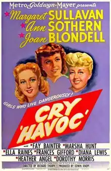 Cry 'Havoc' is a 1943 American war drama film, produced by Metro-Goldwyn-Mayer and directed by Richard Thorpe. It stars Margaret Sullavan, Ann Sothern and Joan Blondell, and features Fay Bainter, Marsha Hunt, Ella Raines, Frances Gifford, Diana Lewis, Heather Angel, Dorothy Morris and Connie Gilchrist.