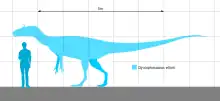 Cryolophosaurus was a large, well-built theropod, one of the largest of its time. The holotype specimen is estimated to have reached 6–7 m (20–23 ft) long and weighed 350–465 kg (772–1,025 lb).[4][5][6] In 2016 Molina-Pérez and Larramendi gave a larger estimation of 7.7 meters (25.3 ft) and 780 kg (1,720 lb).[7] Some researchers noted that the holotype individual probably represents a sub-adult, so adults could have been larger.[5][8] Despite having slender proportions, Cryolophosaurus is one of the largest known Early Jurassic theropods.[8][9]