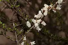 Cryptandra armata is a shrub that typically grows to a height of up to 1.5 m (4 ft 11 in) and has branchlets 0.5–1.5 m (1 ft 8 in – 4 ft 11 in) long, covered with hairs when young, and ending in a sharp spine. The leaves are spatula-shaped or lance-shaped to egg-shaped with the narrower end towards the base and often clustered, 1.4–5.2 mm (0.055–0.205 in) long and 0.4–1.4 mm (0.016–0.055 in) wide on a petiole 0.3–0.5 mm (0.012–0.020 in) long. There are narrow triangular stipules 0.9–1.4 mm (0.035–0.055 in) long at the base of the petioles. The flowers are usually borne singly on short pedicels with brown bracts at the base. The floral tube is 2.5–3.0 mm (0.098–0.118 in) long, the lobes 1.0–1.6 mm (0.039–0.063 in) long and the petals are white, protruding 1.0–1.2 mm (0.039–0.047 in) beyond the end of the floral tube, and hooded. Flowering occurs from July to September and the fruit is an elliptic capsule, the seeds about 2.3 mm (0.091 in) long with a white aril.[2][3]
