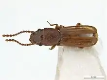 Cryptolestes is a genus of beetles in the family Laemophloeidae. Several species are known as economically important pests of stored products, especially food grains. The four most notorious species are Cryptolestes ferrugineus, Cryptolestes pusilloides, Cryptolestes pusillus, and Cryptolestes turcicus.[1] C. capensis, C. klapperichi, and C. ugandae are less widespread pests.[1] Species in this genus can be hard to distinguish from one another, and definitive identification often requires close examination of the genitalia.[2]