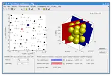 Graphical user interface provides user with two interactive views side by side. These views can display arbitrary combination of the four aforementioned visualization modes allowing to perceive their mutual relations. For instance, rotation of the atomic structure in direct space leads (if set so) to an instant update of the simulated diffraction pattern. If any diffraction spot is selected, corresponding crystallographic planes are shown in the unit cell etc. Such interconnections are implemented for each pair of the four available visualization modes. The electronic visualization allows to simplify understanding of widely used, yet less intuitive representations such as the inverse pole figure. For instance by drawing the coloured triangle of the inverse pole figure into the stereographic projection or to the more intuitive 3D atomic structure.[1]