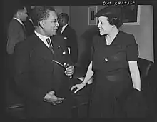 By some historical accounts, Fauset is considered a member of President Roosevelt's "Black Cabinet" that promoted civil rights for African Americans.[10] Despite her ten-year involvement with the Democratic Party, Fauset broke away after questioning the Party's inaction on supporting African American voters and civil rights, and becoming discontented with the Roosevelt administration's slow record on civil rights and the President's discouragement of meetings about racial matters during the 1944 presidential campaign. Fauset became a member of the Republican National Committee's division on Negro Affairs in 1944 and publicly endorsed Thomas E. Dewey, the Republican presidential candidate. Her announcement received mixed reactions among African American newspapers. Dewey would eventually be defeated by Roosevelt in the elections.[7][11]