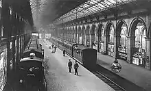 The trainshed was divided lengthways into two cavernous spaces separated by a brick-arch arcade, each side having two tracks with wooden platforms. The inner track on each side had two platform faces to support mass arrivals.