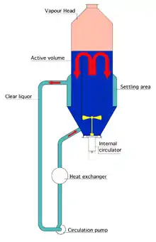 Whichever the form of the crystallizer, to achieve an effective process control it is important to control the retention time and the crystal mass, to obtain the optimum conditions in terms of crystal specific surface and the fastest possible growth. This is achieved by a separation – to put it simply – of the crystals from the liquid mass, in order to manage the two flows in a different way. The practical way is to perform a gravity settling to be able to extract (and possibly recycle separately) the (almost) clear liquid, while managing the mass flow around the crystallizer to obtain a precise slurry density elsewhere. A typical example is the DTB (Draft Tube and Baffle) crystallizer, an idea of Richard Chisum Bennett (a Swenson engineer and later President of Swenson) at the end of the 1950s. The DTB crystallizer (see images) has an internal circulator, typically an axial flow mixer – yellow – pushing upwards in a draft tube while outside the crystallizer there is a settling area in an annulus; in it the exhaust solution moves upwards at a very low velocity, so that large crystals settle – and return to the main circulation – while only the fines, below a given grain size are extracted and eventually destroyed by increasing or decreasing temperature, thus creating additional supersaturation. A quasi-perfect control of all parameters is achieved as DTF crystallizers offer superior control over crystal size and characteristics.[8] This crystallizer, and the derivative models (Krystal, CSC, etc.) could be the ultimate solution if not for a major limitation in the evaporative capacity, due to the limited diameter of the vapor head and the relatively low external circulation not allowing large amounts of energy to be supplied to the system.