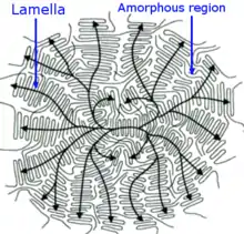Crystallization of polymers is a process associated with partial alignment of their molecular chains. These chains fold together and form ordered regions called lamellae, which compose larger spheroidal structures named spherulites.[1][2] Polymers can crystallize upon cooling from melting, mechanical stretching or solvent evaporation. Crystallization affects optical, mechanical, thermal and chemical properties of the polymer. The degree of crystallinity is estimated by different analytical methods and it typically ranges between 10 and 80%, with crystallized polymers often called "semi-crystalline". The properties of semi-crystalline polymers are determined not only by the degree of crystallinity, but also by the size and orientation of the molecular chains.