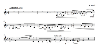"Csárdás" (or "Czardas") is a rhapsodical concert piece by the Italian composer Vittorio Monti. Written in 1904, the well-known folkloric piece is based on a Hungarian csárdás.[1] It was originally composed for violin, mandolin, or piano.[2] There are arrangements for orchestra and for a number of solo instruments. "Csárdás" is about four-and-a-half minutes in duration.[2]