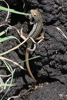 Lizards in the genus Ctenotus are commonly called comb-eared skinks, a reference to the scales aligned near the ear.[3] Ctenotus lizards are able to move very quickly, disappearing whilst being observed. They are highly active in their habits, foraging amongst a diverse range of habitat.