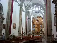 The cathedral has a Latin cross plan with elevated proportions, and a nave with transept of Baroque columns.