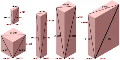 The smallest Euler brick, discovered by Paul Halcke in 1719, has edges (a, b, c) = (44, 117, 240) and face diagonals (d, e, f ) = (125, 244, 267).[2] Some other small primitive solutions, given as edges (a, b, c) — face diagonals (d, e, f), are below: