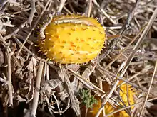 Its stems and leaves are hairy and the leaves are ovate to round in shape and cordate at the bases and measure 2–4 centimeters in length. They have 3–5 blunt-toothed lobes. Male flowers occur in clusters of 2–3 and are rarely solitary; female flowers are always solitary. They have five yellow petals. The fruit is slightly ovoid and is vertically striped and yellow in color when ripe. It measures 3–4 centimeters in length and is covered in spike-like pustules.[3] It grows wild in semi-desert bushland and grassland up to 6,594 feet (2,010 meters) in elevation, often with acacia trees.[4]