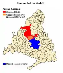 The Cuenca Alta del Manzanares Regional Park, created in 1985, is the natural space protected area with the largest extension in the Community of Madrid (Spain) and one of the most ecologically and scenically valuable.[1] It is located in the northwest of the region and extends around the upper course of the Manzanares River, along 42 583 ha. Its main municipalities of reference are Manzanares el Real and Hoyo de Manzanares. Unesco declared it a Biosphere Reserve in 1992.[2]