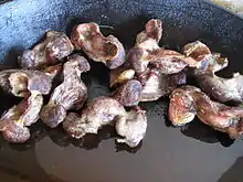 The cuisine of Gascony is characterised by the use of regional products such as duck fat and duck foie gras, salted ham, and the famous mild chilli of Gascony. Common condiments are Bezolles mustard, garlic, persillade, and onion. The cèpe mushroom is frequently eaten; Tricholoma equestre was traditionally eaten but is now considered poisonous after several cases of rhabdomyolysis were linked to its consumption. Larks and the common wood pigeon are commonly eaten game birds; the ortolan, previously commonly eaten, has been a protected species since 1999. Coastal seafood includes oysters, peppery furrowshells, eel elvers, lampreys, and shad.