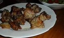 Dishes include lechazo asado (roast veal or lamb), cochinillo asado (roast suckling pig), cordero asado (roast lamb), morcilla (blood sausage or black pudding), asados al Sarmiento (roasted meat with wine), a typical dish in Santibáñez de Valcorba and environs, chuletones de buey (a large ox steak) with ajillo (garlic), typical in Peñafiel). The embutido (sausage) called chitas (cheetahs) is well known, prepared with the meat of suckling pig in adobo.
