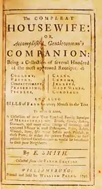 A preference for British cooking methods is apparent in cookbooks brought to the New World. There was a general disdain for French cookery, even among the French Huguenots in South Carolina and French Canadians.[15] One cookbook common in the colonies, The Art of Cookery Made Plain and Easy, by Hannah Glasse, held the French style of cookery in disdain, stating "the blind folly of this age that would rather be imposed on by a French booby, than give encouragement to a good English cook!"[16] She does add French recipes to the text but speaks out flagrantly against the dishes, "... think(ing) it an odd jumble of trash."[16]