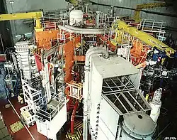 The reactor was built at a new site next to the Culham Centre for Fusion Energy, the UK's fusion research laboratory which opened in 1965. The construction of the buildings was undertaken by Tarmac Construction,[14] starting in 1978 with the Torus Hall. The Hall was completed in January 1982 and construction of the JET machine itself began immediately after the completion of the Torus Hall.[13] The cost was 198.8 Million European Units of Account (predecessor to the Euro)[15] or 438 million in 2014 US dollars.[16]
