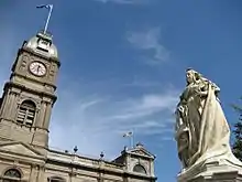 Most of the large cities in Australia that prospered during the Victorian era feature prominent statues of Queen Victoria. Sydney, the capital city of New South Wales has several. There is one statue (re-sited from the forecourt of the Irish Parliament building in Dublin) dominating the southern entrance to the Queen Victoria Building that was named in her honour in 1898. Another Sydney statue of Queen Victoria stands in the forecourt of the Federal Court of Australia building on Macquarie Street, looking across the road to a statue of her husband, inscribed "Albert the Good". In Melbourne, the capital of Victoria, the Queen Victoria Gardens named after her also features a large memorial statue in marble and granite. In Perth, capital city of Western Australia a marble statue stands in King's Park overlooking the city. In Adelaide, capital city of the state of South Australia, the Queen Victoria Square, named after her also has a large statue of her.[19] In Brisbane, capital city of the state of Queensland, there is a statue of her in Queens Square, also named for her;.[20] Ballarat, a boomtown in Victoria has a statue of Queen Victoria in the main street directly opposite its town hall. A small bust of the Queen is in the Queen Victoria Gardens in Burnt Pine, the largest town in the Australian territory of Norfolk Island.