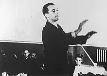 In Theresienstadt, cultural production thrived much more than in the Protectorate. Art in the ghetto underwent drastic development as it allowed for depiction and representation of true life in Theresienstadt.[10] The artwork provided the people with an artistic outlet through which they could express their feelings of defiance.[14] Despite constant deportations of inmates to the East, the ghetto inhabitants remained determined to continue performing and creating. Places in casts often needed to be reassigned as participants were deported.[10] The people remained strong willed in their persistence to create, as it helped them remain hopeful and live a more humane existence.[10] Rafael Schachter was one of the pioneering members of cultural activity in Theresienstadt. In the early days of Theresienstadt’s cultural activity, Schachter included a satirical sketch in his first performance.[15] Later in his time in Theresienstadt, Schachter put together a rendition of Verdi’s Requiem. In this version of Requiem, Schachter changed the ending notes to communicate a resistance signal. Adolf Eichmann and other important Nazi leaders were in the audience for a performance of Schachter’s Requiem, and Eichmann specifically enjoyed this version of the piece.[16] The Nazis didn't understand the underlying meanings of the change to Requiem or many other works performed in the ghetto.[17]